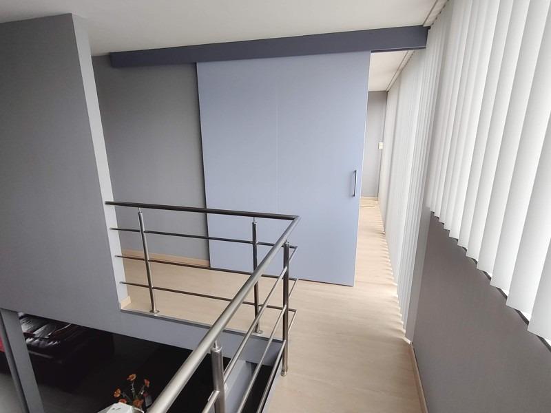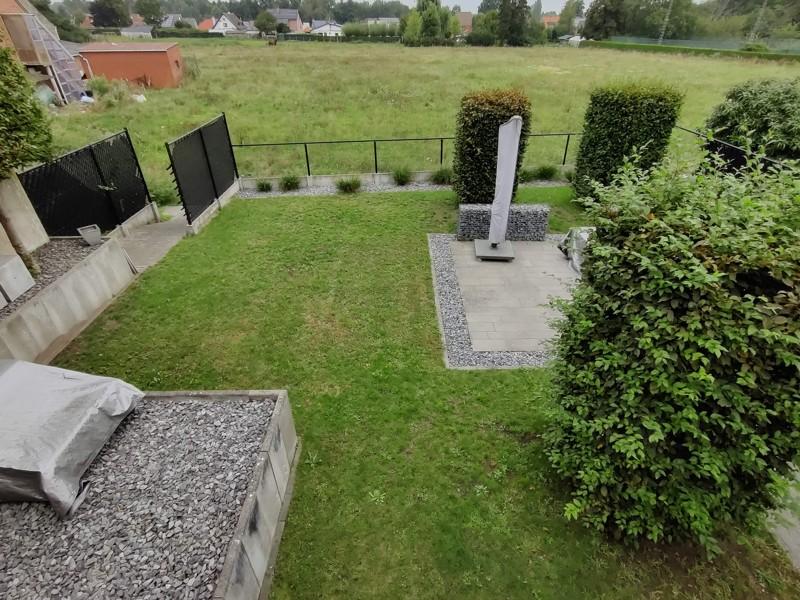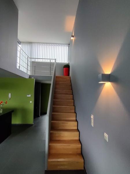 De duplex bevindt zich op de eerste en tweede verdieping van een kleinschalig woonproject. Bij het binnenkomen zien we een inkomhal, grote leefruimte met zitplaats, eetplaats en volledig uitgeruste open keuken. Verder is er nog een berging, toilet en terras. Het terras biedt zicht over de bijhorende privatieve tuin en de achterliggende groene weilanden. Op de verdieping van de duplex vinden we een badkamer, twee slaapkamers en een zuidgericht terras terug. Het appartement beschikt bijkomend nog over twee privatieve staanplaatsen (waarvan één overdekt) en een tweede berging.